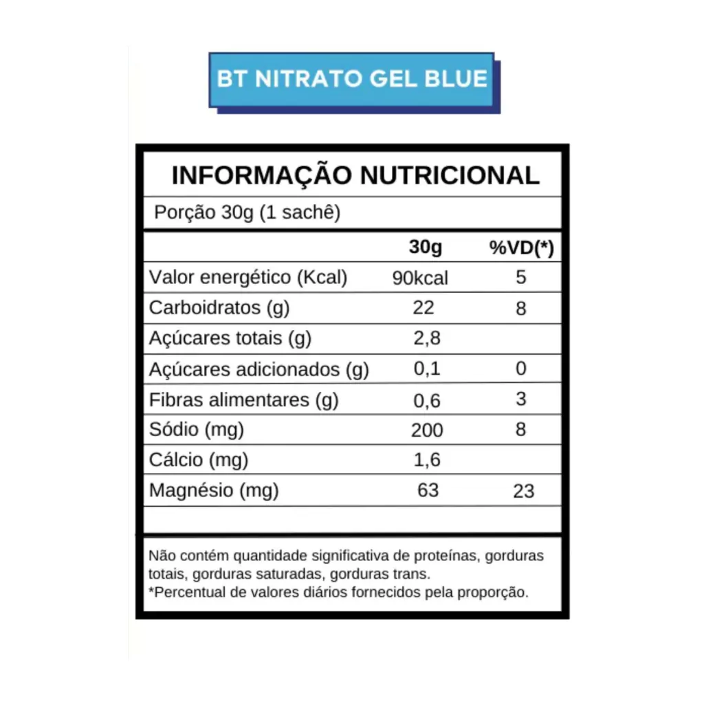 Com carboidratos, eletrólitos e 400mg de nitrato proveniente da beterraba, o BT Nitrato Gel foi formulado para atletas que buscam melhorar sua eficiência energética. Produtos de nutrição esportiva ricos em nitrato podem ter um impacto direto na eficiência energética e, como resultado, melhorar o desempenho do atleta, através do aumento de óxido nítrico e consequente melhora da circulação e redução do custo de oxigênio durante o exercício.